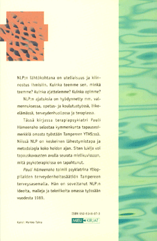 NLP:n ajatuksia on hyödynnetty mm. valmennuksessa, opetus- ja koulutustyössä, liike-elämässä, terveydenhuollossa ja terapiassa. Tässä kirjassa terapiapsykiatri Pauli Hämeenaho selostaa kymmenkunta tapausesimerkkiä omasta työstään Tampereen YTHS:ssä. Niissä NLP on keskeinen lähestymistapa ja metodologia koko hoidon ajan. Siten lukia voi tapauskuvausten avulla seurata mielikuvissaan, mitä psykoterapioissa on tapahtunut. Kirja estelee kaikki keskeiset NLP -mallit ja -muutosmenetelmät erityisesti terapiatyön kannalta. Soveltuu NLP:n alustavaan perehtymiseen muillekin kuin terapeuteille. |